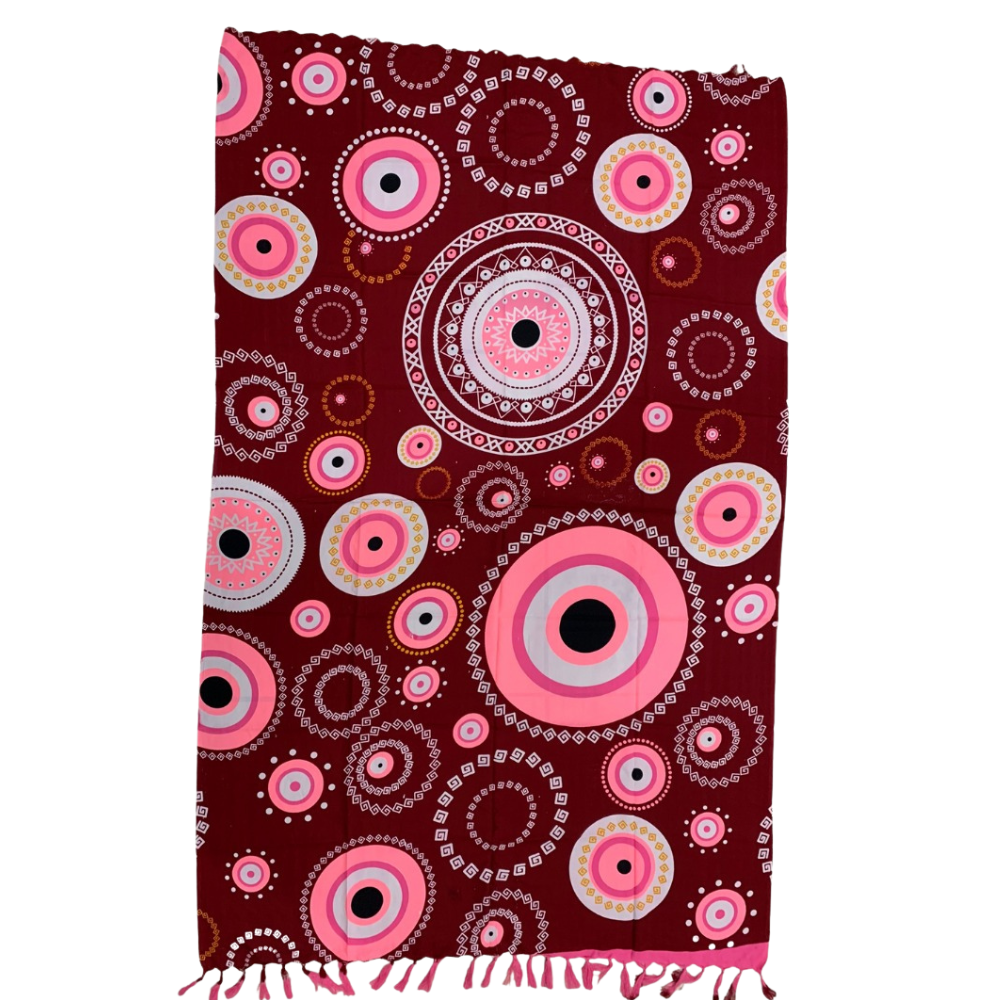 Tem um design moderno e elegante, com uma estampa vibrante e franjas em sua borda. Adicionam um toque de estilo e textura, além de serem úteis para secar o corpo após um mergulho na água.