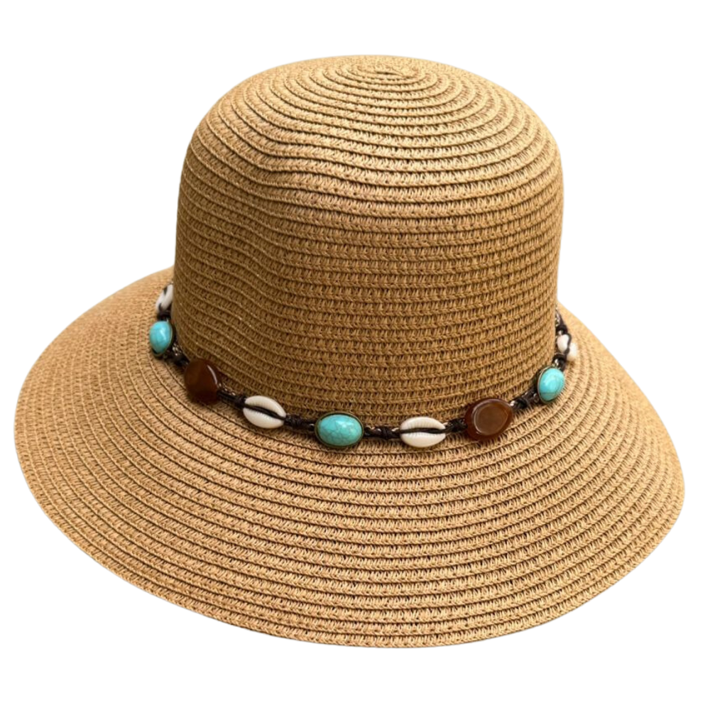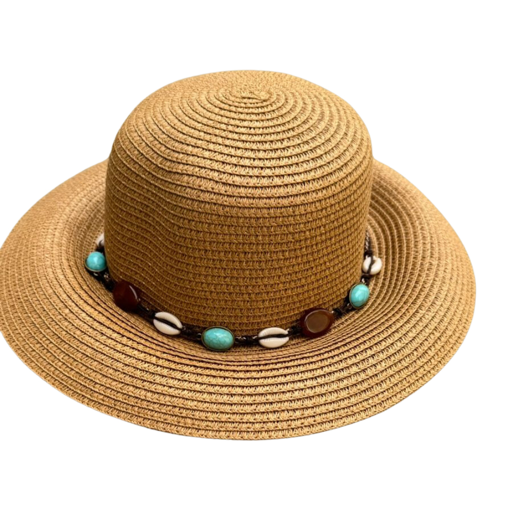 • Detalhes Decorativos: Acompanha um cordão de conchas com pedras alternadas, adicionando um toque de estilo e elegância ao chapéu.